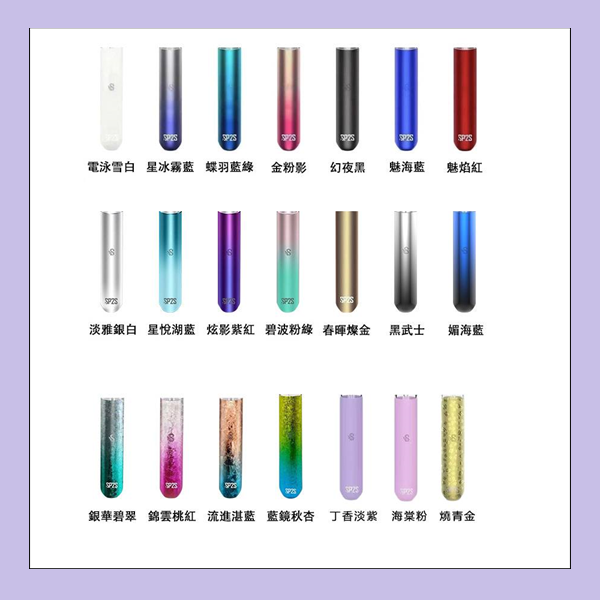丁香淡紫, 海棠粉, 媚海藍, 淡雅銀白, 蝶羽藍綠, 媚艷紅, 金粉影, 幻影黑, 新年金, 星悅湖藍, 燒青金, 碧波粉綠, 電泳雪白, 魅海藍, 黑武士